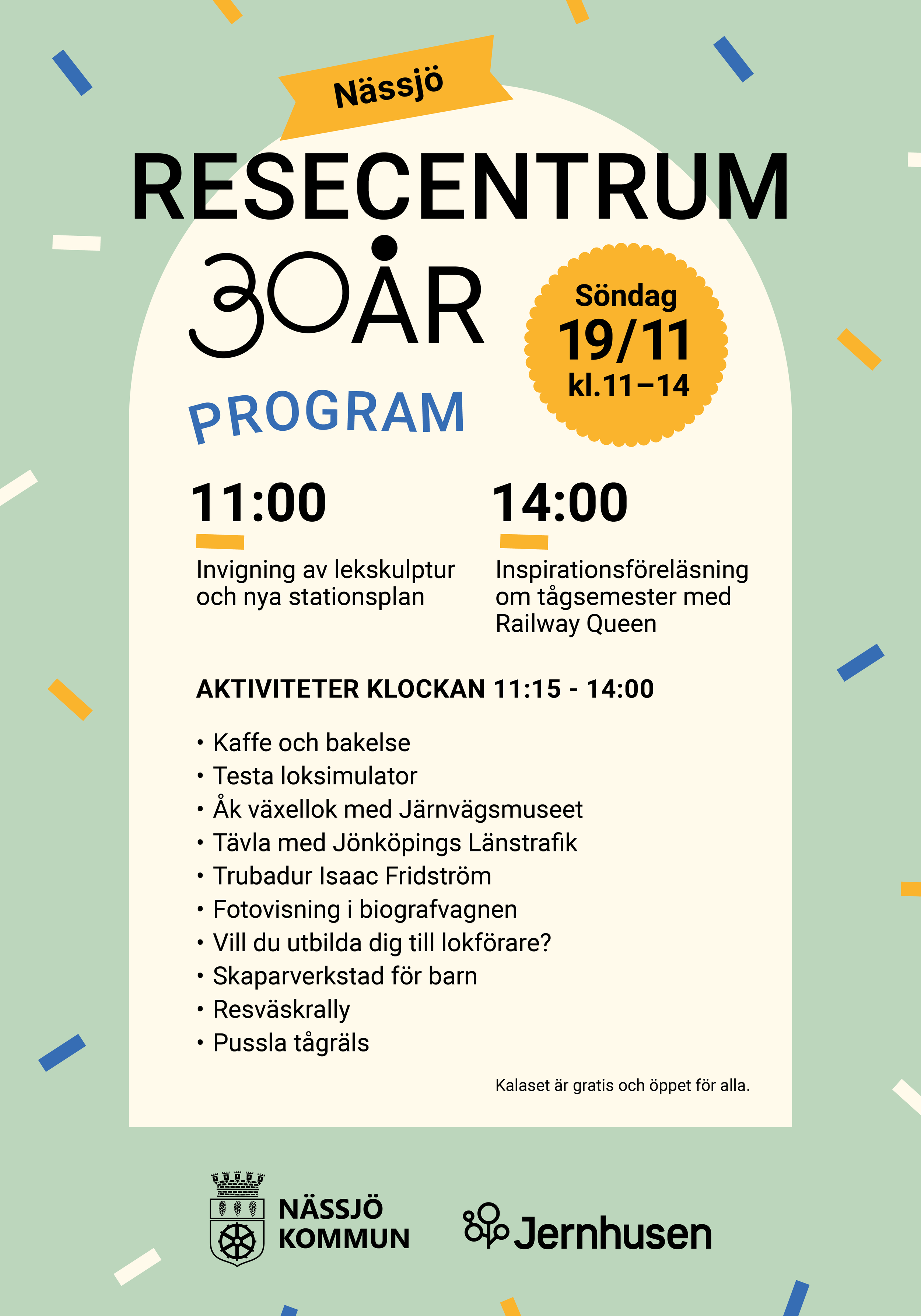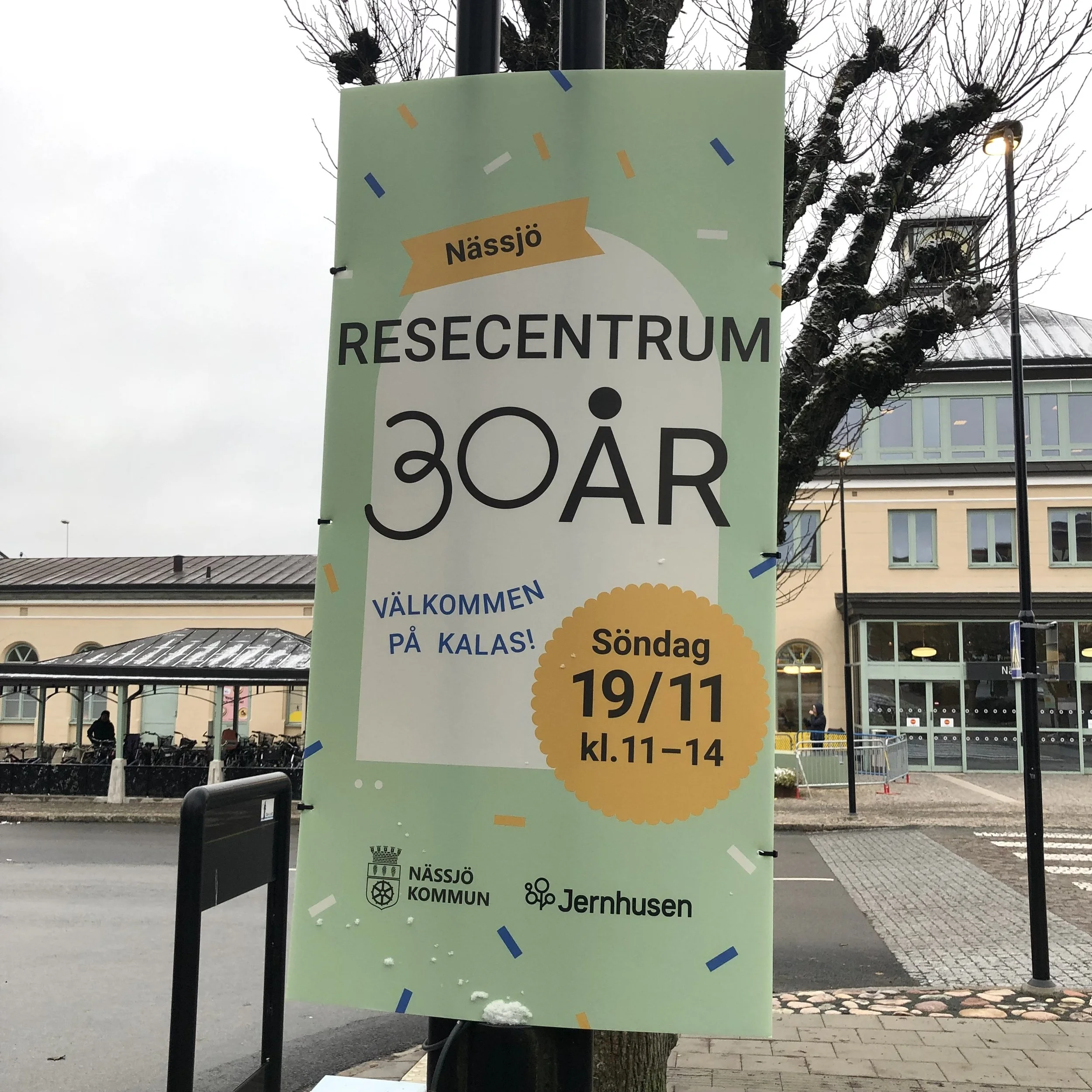 Designuppdrag på hemmaplan! Resecentrum Nässjö firade 30 år och bjöd in till kalas! Identitet och formgivning av marknadsföringsmaterial till evenemanget. Print och digitalt. På uppdrag av Nässjö kommun.