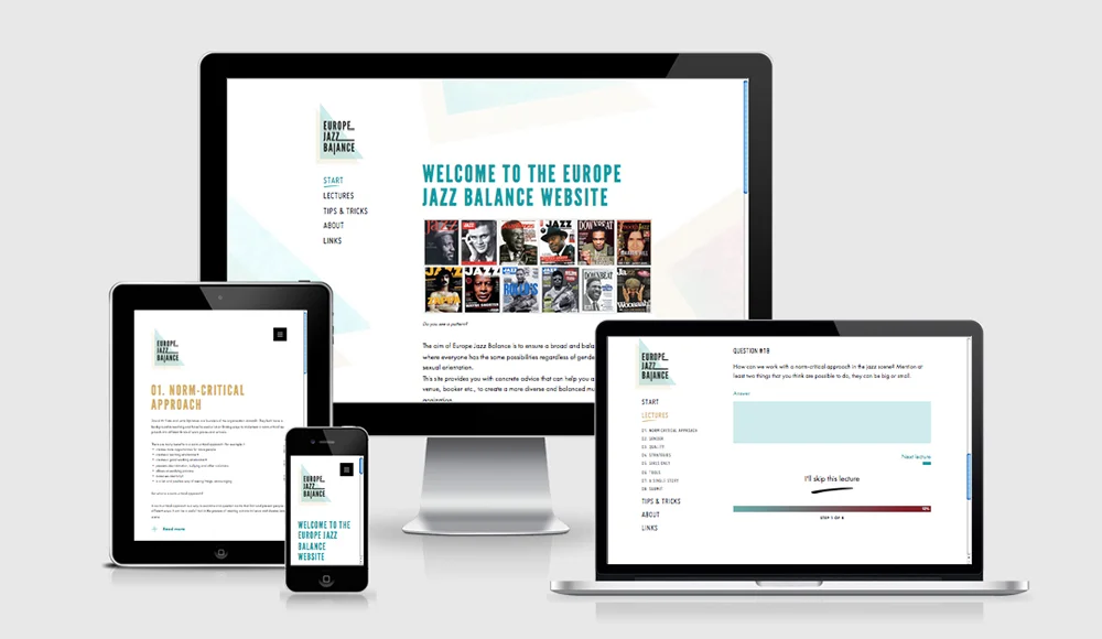 Vi på Bon Voyage har tagit fram en visuell identitet, informationsarkitektur och webbdesign till www.europejazzbalance.net. Projektet är ett handledningsprogram för arrangörer för att hjälpa dem att arbeta mer aktivt med normkritiska frågor för att göra jazzscenen mer öppen och tillåtande. www.lassez.se stod för webbutvecklingen.