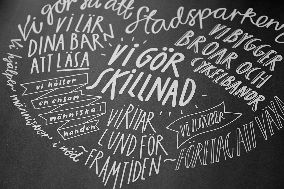 Att handtypografera är en favorit! Jag har en kärlek till det analoga i designprocessen. Oftast går steget från penna och papper till datorn alldeles för snabbt, i tron att det skyndar på processen. Vilket det oftast inte gör för min del. Det var därför väldigt givande och roligt att utföra uppdraget åt Lunds kommun. Att handtypografera och illustrera ett antal peppande budskap.
